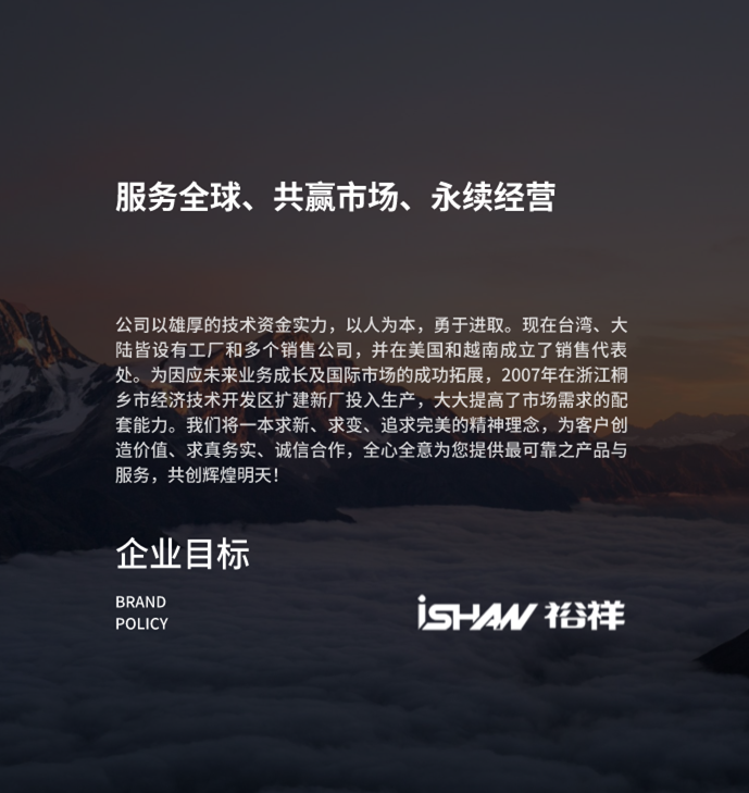 公司以雄厚的技術(shù)資金實(shí)力,以人為本,勇于進(jìn)取?,F(xiàn)在臺(tái)灣、大陸皆設(shè)有工廠和多個(gè)銷售公司,并在美國(guó)和越南成立了銷售代表處。為因應(yīng)未來業(yè)務(wù)成長(zhǎng)及國(guó)際市場(chǎng)的成功拓展,2007年在浙江桐鄉(xiāng)市經(jīng)濟(jì)技術(shù)開發(fā)區(qū)擴(kuò)建新廠投入生產(chǎn),大大提高了市場(chǎng)需求的配套能力。我們將一本求新、求變、追求完美的精神理念,為客戶創(chuàng)造價(jià)值、求真務(wù)實(shí)、誠(chéng)信合作,全心全意為您提供最可靠之產(chǎn)品與服務(wù),共創(chuàng)輝煌明天!